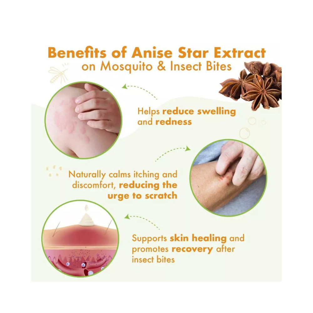 Mosquito & Insect Bite Relief Cream is specially formulated to provide fast and gentle relief from insect bites. Powered by Star Anise Extract and Tea Tree Oil, it helps to stop itchiness, reduce swelling, and cool down burning discomfort with a refreshing sensation. Made with 98.50% natural origin ingredients, this cream is safe for all ages—including newborns—and suitable for normal and sensitive skin. Beyond soothing relief, it is also rich in antioxidants and helps to promote skin recovery, making it perfect for irritated or damaged skin after a bite.