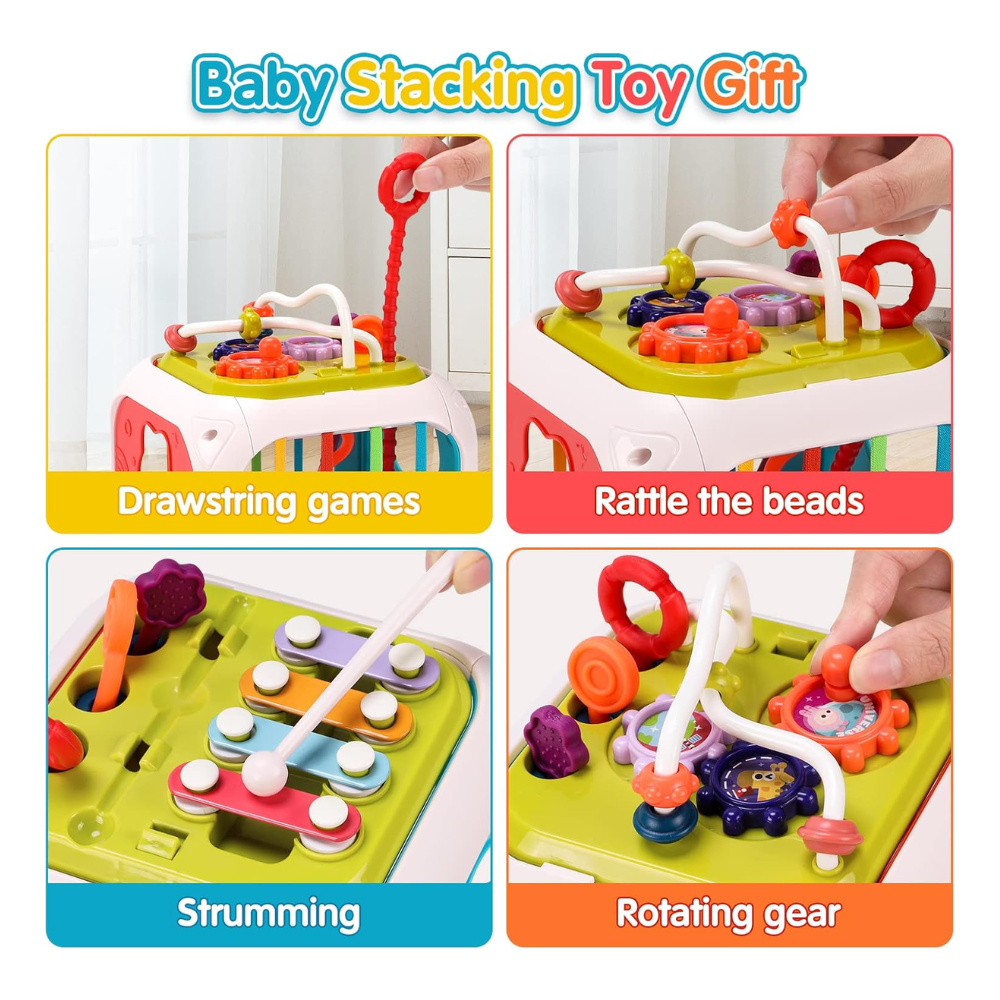 Includes a sensory box, shape sorter, pull strings, jingle bells, musical xylophone, bead maze, spinning gears, and stacking blocks. Encourages sensory exploration, hand–eye coordination, gross and fine motor skills, and color & shape recognition.