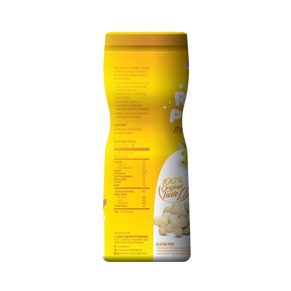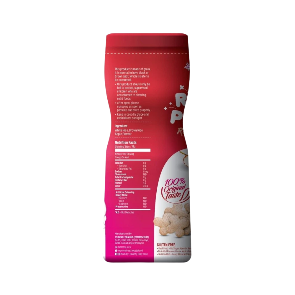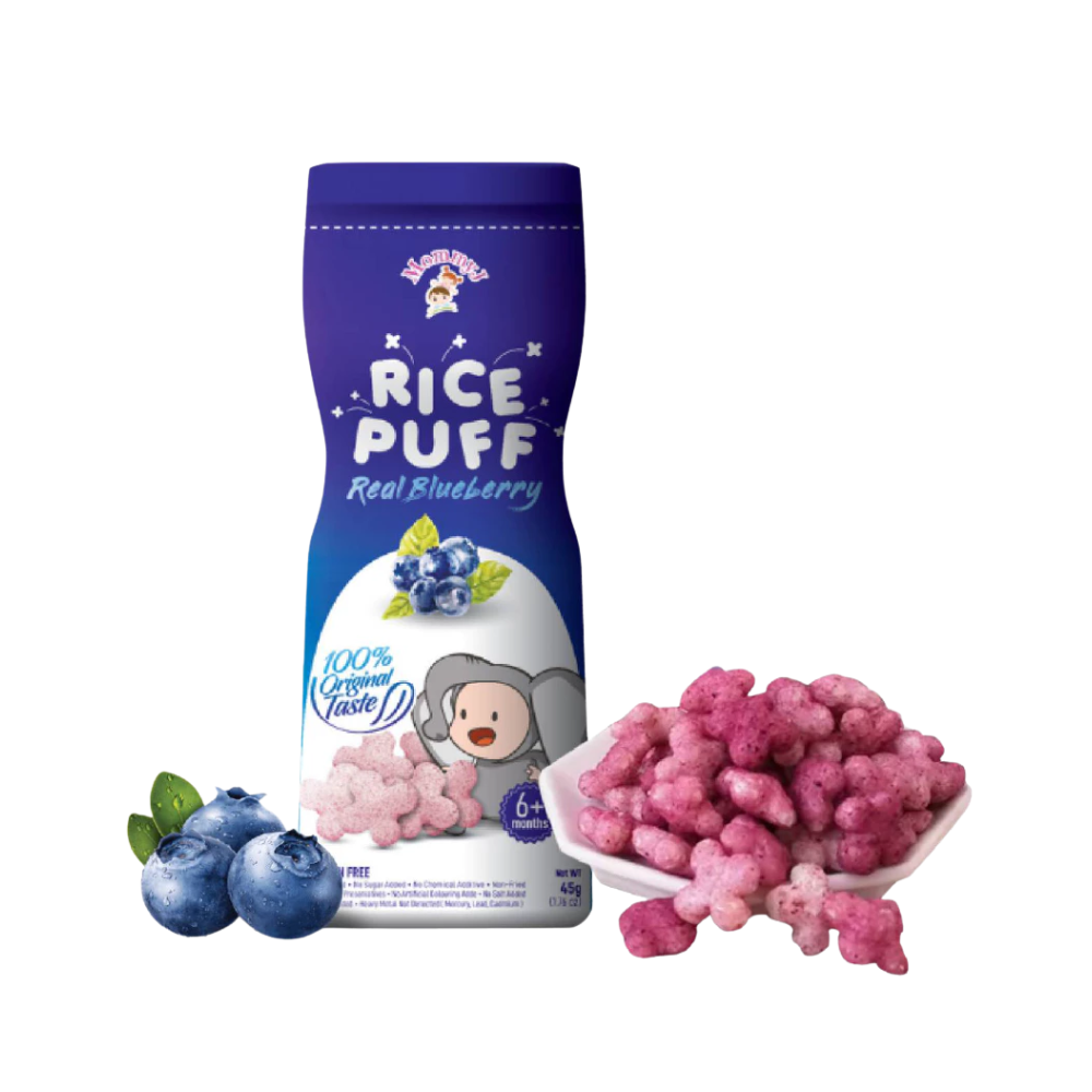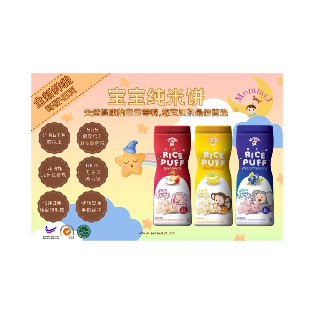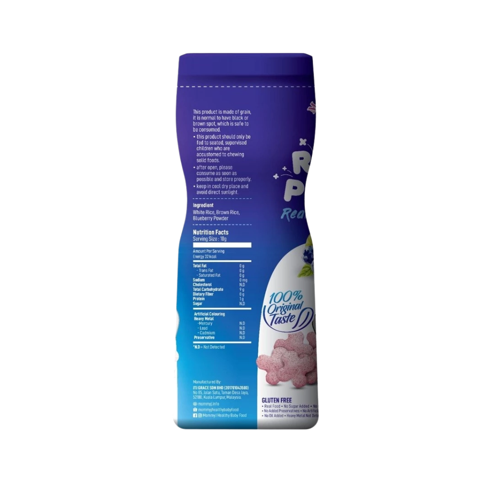 MommyJ® Baby Pure Rice PUFF made from only 3 original ingredients: 1) white rice + 2) brown rice + 3) pure apples / pure bananas / pure blueberries. ⛔ Generally, baby rice puff on shelf contain many unhealthy additives, such as: high fructose, corn syrup, sugar, salt, oil (vegetable oil vegetable oil / palm oil), artificial colouring, food flavouring, corn starch , with many unknown ingredients. What you put in your baby’s tummy might be the most important one of all. 👼 4. Not Fruits Extract nor concentrate And the pure apple/pure banana/pure blueberry in MommyJ® Baby Pure Rice PUFF is pure fruit powder, not fruit extract nor concentrate. (Extract / essence / concentration is concentrated and refined, the active ingredients of the ingredients will become blunt. Relatively speaking, the nutrients are not high). 👼 5. SGS lab tested - Quality Assurance MommyJ® Baby Pure Rice PUFF are brought to SGS – which is the world's leading inspection, verification, testing and certification company for lab test .And the test result is Zero heavy metal ( from mercury, lead,cadmium) . 👼 6. New bottle packaging Easy to store,avoid unfinished portion might turn soggy and loss of taste🤭 👼 7. Train oral muscles, finger muscles and hand-eye coordination. All of the tastes, textures, smells and sights of food are there for your baby to explore with their little hands, mouth, tongue and teeth or gums. Not only is this beneficial for their sensory development but it also helps familiarize them with a variety of foods in all their forms. Allowing baby to lead the process lets fun into meal times. 🔖Total Weight :