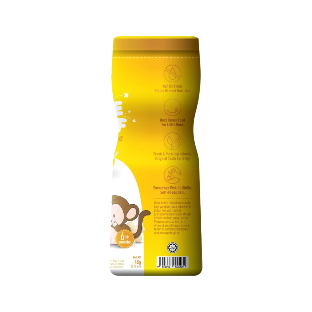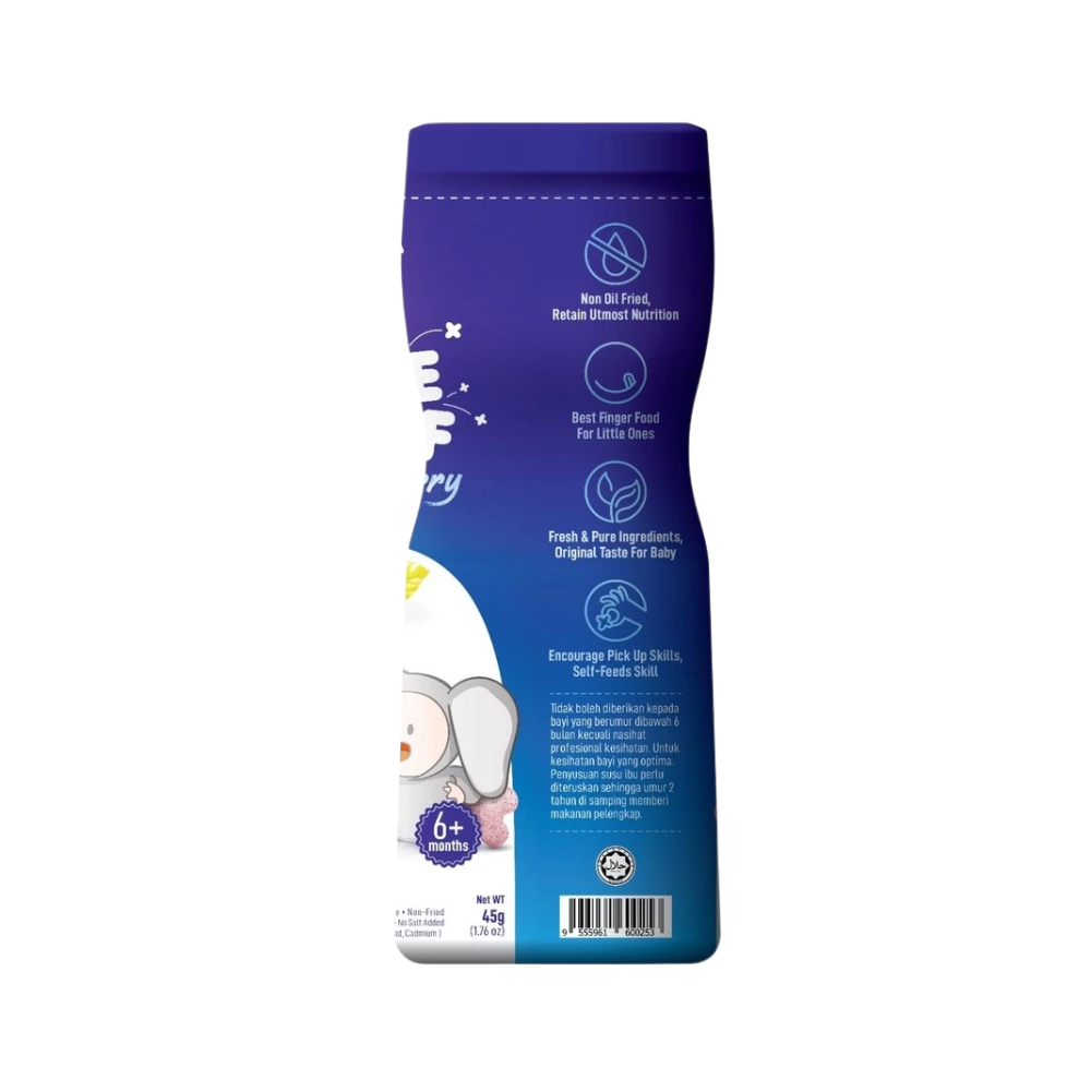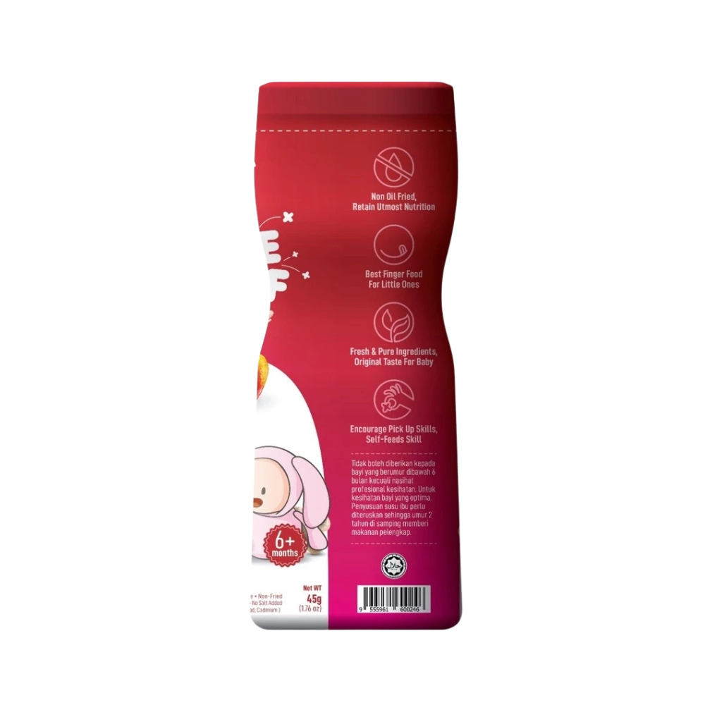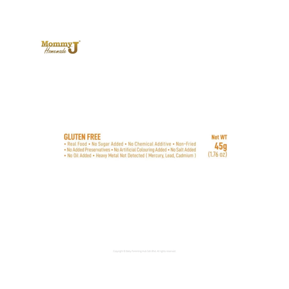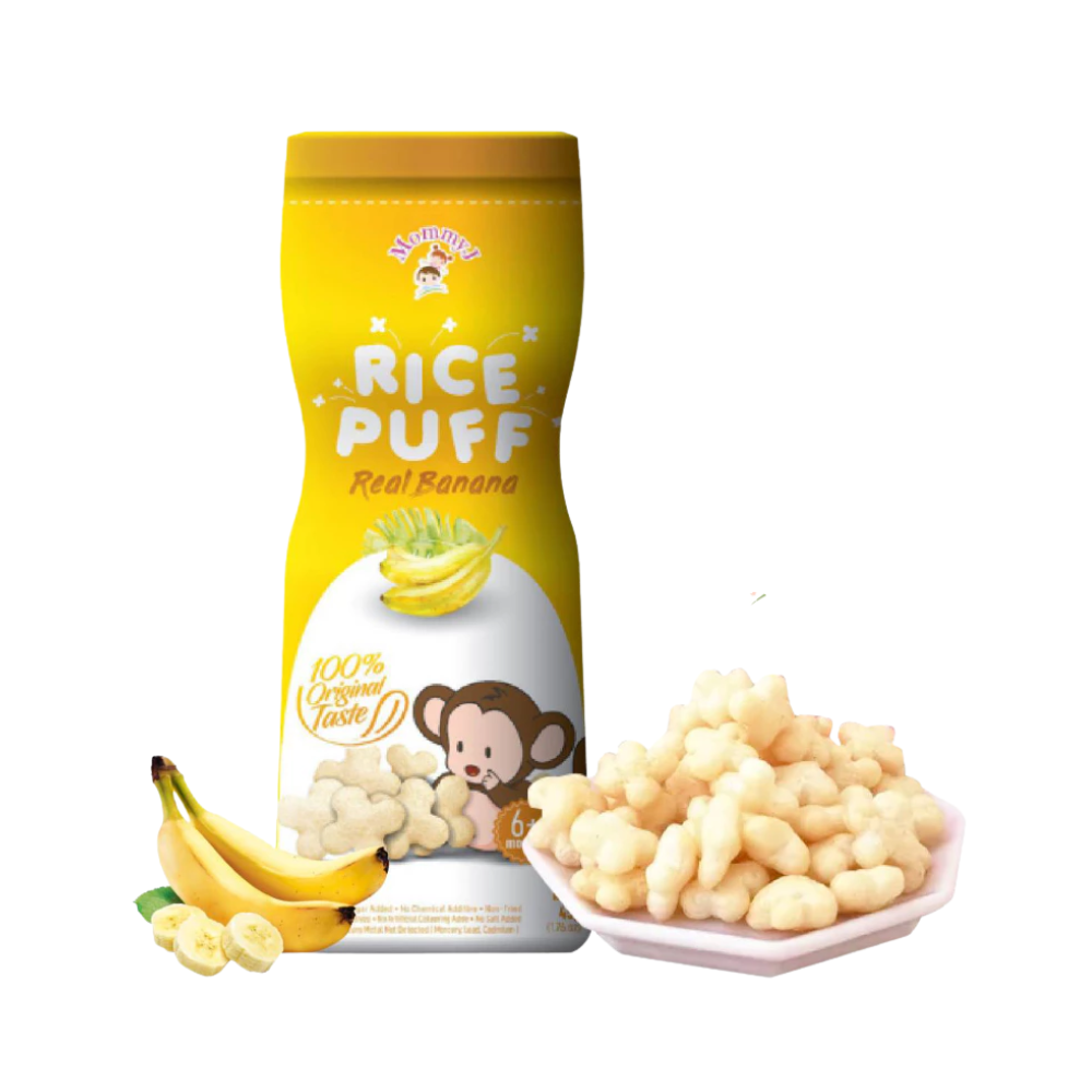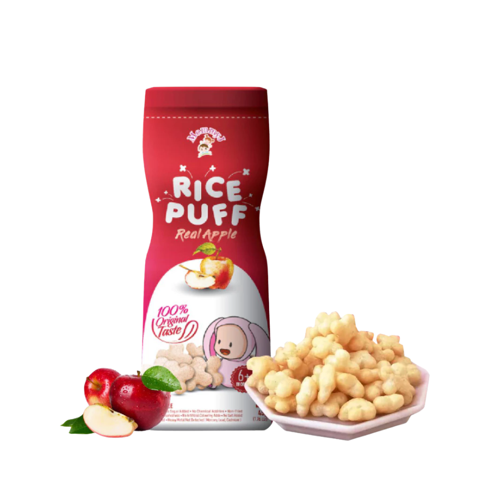 MommyJ® Baby Pure Rice PUFF made from only 3 original ingredients: 1) white rice + 2) brown rice + 3) pure apples / pure bananas / pure blueberries. ⛔ Generally, baby rice puff on shelf contain many unhealthy additives, such as: high fructose, corn syrup, sugar, salt, oil (vegetable oil vegetable oil / palm oil), artificial colouring, food flavouring, corn starch , with many unknown ingredients. What you put in your baby’s tummy might be the most important one of all. 👼 4. Not Fruits Extract nor concentrate And the pure apple/pure banana/pure blueberry in MommyJ® Baby Pure Rice PUFF is pure fruit powder, not fruit extract nor concentrate. (Extract / essence / concentration is concentrated and refined, the active ingredients of the ingredients will become blunt. Relatively speaking, the nutrients are not high). 👼 5. SGS lab tested - Quality Assurance MommyJ® Baby Pure Rice PUFF are brought to SGS – which is the world's leading inspection, verification, testing and certification company for lab test .And the test result is Zero heavy metal ( from mercury, lead,cadmium) . 👼 6. New bottle packaging Easy to store,avoid unfinished portion might turn soggy and loss of taste🤭 👼 7. Train oral muscles, finger muscles and hand-eye coordination. All of the tastes, textures, smells and sights of food are there for your baby to explore with their little hands, mouth, tongue and teeth or gums. Not only is this beneficial for their sensory development but it also helps familiarize them with a variety of foods in all their forms. Allowing baby to lead the process lets fun into meal times. 🔖Total Weight :