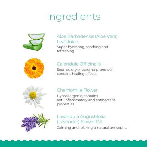 Aloe Barbadensis (Aloe Vera) Leaf Juice, Decyl Glucoside, Coco-Glucoside, Glycerin, Calendula Officinalis (Calendula) Flower, Olea Europaea (Olive) Leaf & Matricaria Chamomilla (Recutita-Chamomile) Flower Extract, Glyceryl Oleate, Sodium Cocoyl Glutamate, Xanthan Gum, Lavandula Angustifolia (Lavender) Flower Oil, Calendula Officinalis Flower, Olea Europaea (Olive) Fruit Oil, Anthemis Nobilis (Roman Chamomile) Oil, Tocopherol (Natural Vitamin E), Calendula Officinalis (Marigold) Flower Extract, Chamomilla Recutita (Matricaria) Flower Extract, Helianthus Annuus (Sunflower) Oil, Dehydroacetic Acid, Benzyl Alcohol, Potassium Hydroxide, Aqua (Water), Lactic Acid