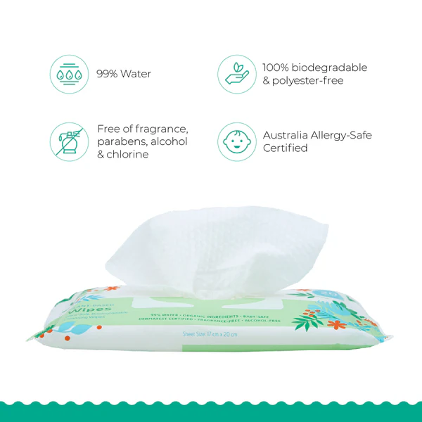 Made from strong yet soft, towel-like biodegradable fiber material — completely free from polyester (plastic) components — these wipes provide gentle cleansing for your baby’s delicate skin. Thoughtfully designed to be kind to both your baby and the planet, they are infused with organic Aloe Vera and organic Chamomile to support healthy, nourished skin. Extra Soft, Extra Gentle, and perfect for cleansing from head to toe, including baby’s mouth and hands. Chemical-Free, Certified Cruelty-Free, and 100% Vegan, these wipes are crafted from FSC-certified plant cellulose material — fully biodegradable for worry-free disposal.